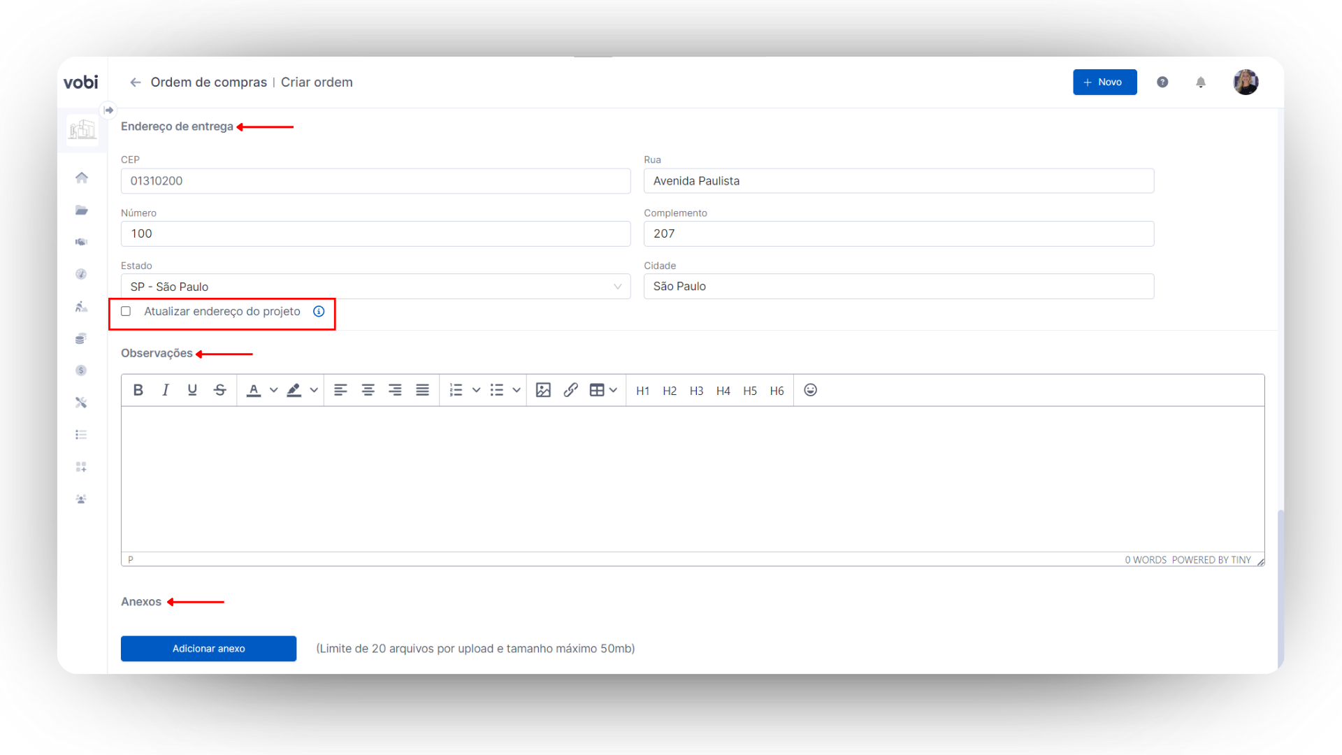 Endereço de entrega: a plataforma preenche automaticamente os campos de Endereço de Entrega com as informações cadastradas no Projeto. Mas se precisar, você pode alterar esse endereço para um diferente ou até mesmo atualizar o endereço do projeto diretamente durante a criação da Ordem de Compra.