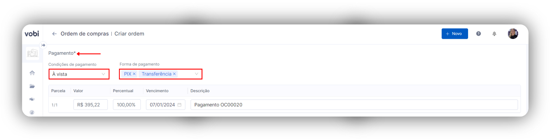 Utilizando a Vobi, ao preencher os detalhes da ordem de compra, é possível adicionar esse desconto diretamente nos campos de valores. O subtotal mostrará a soma total sem descontos, impostos ou fretes.
