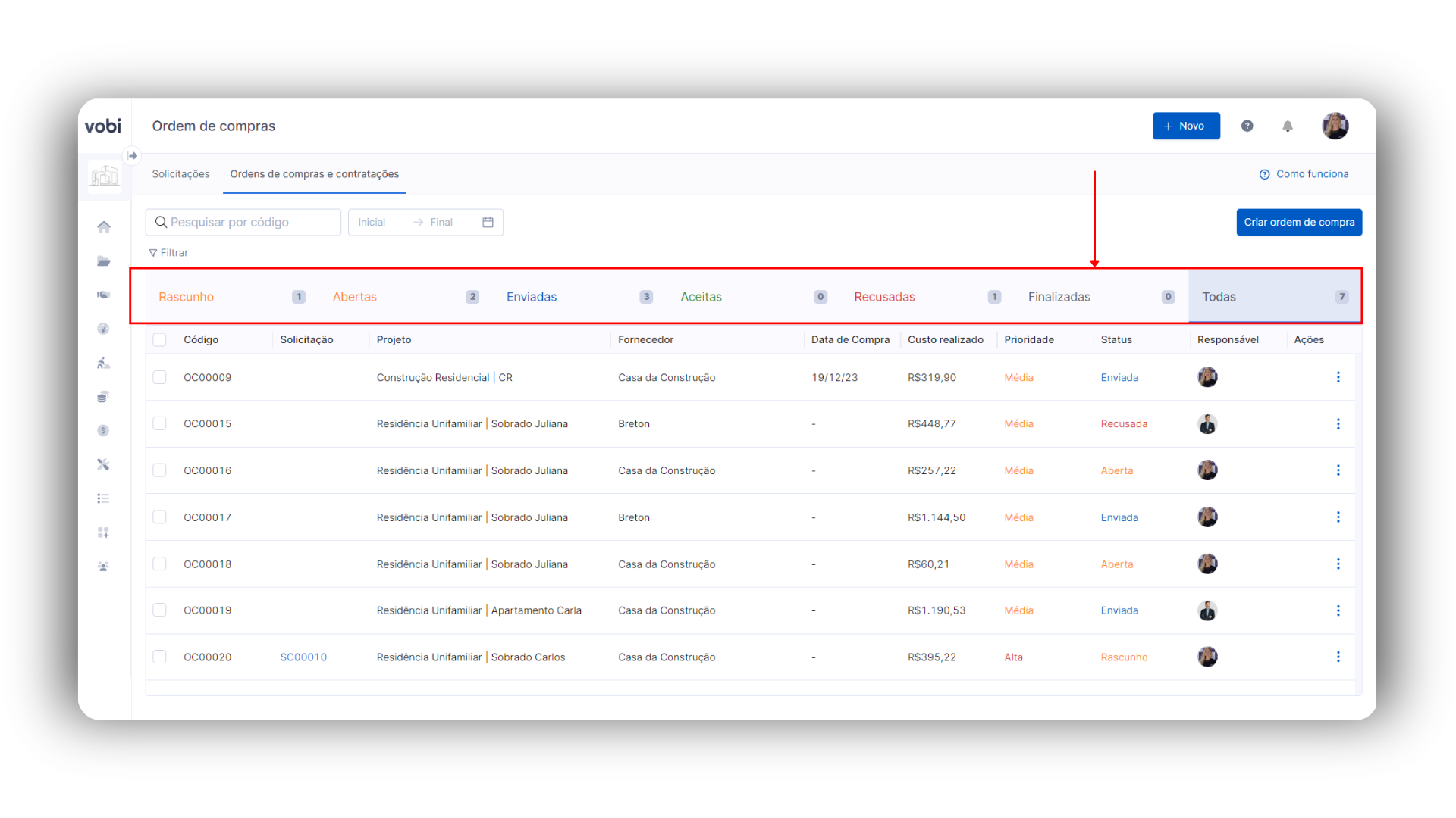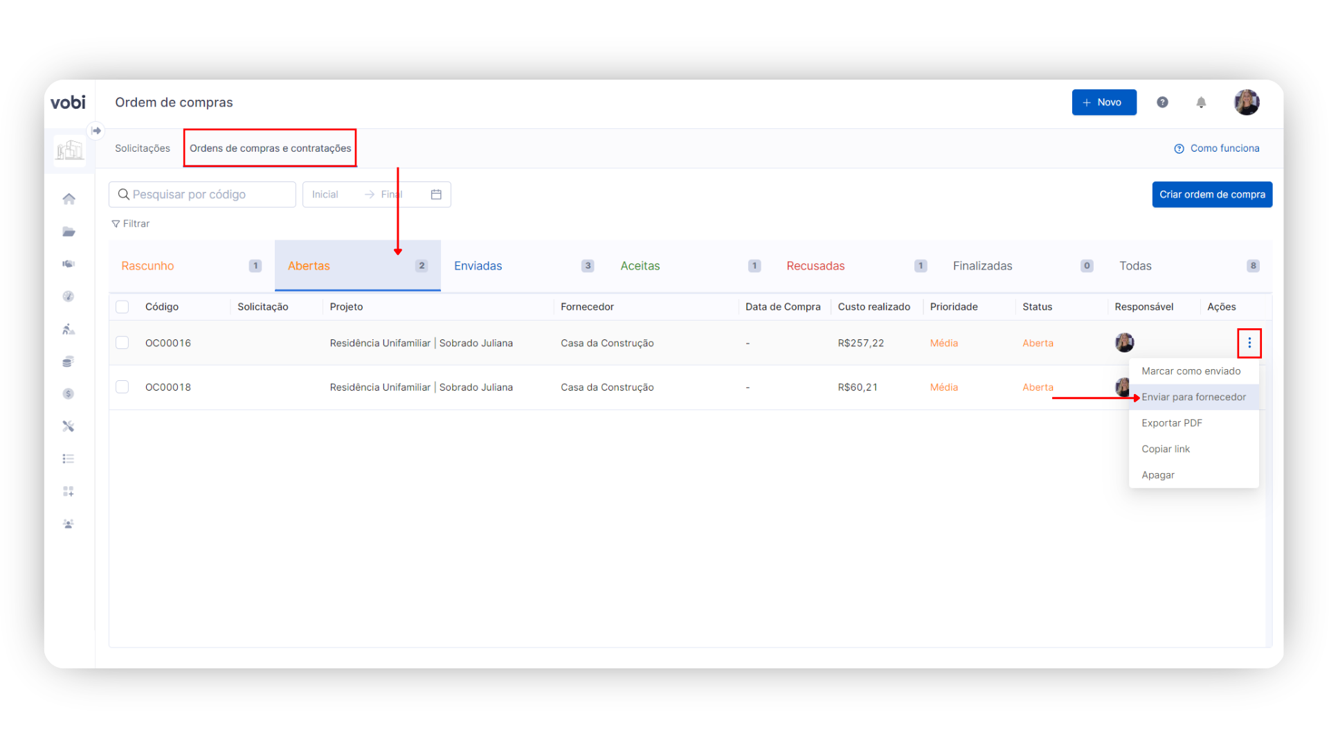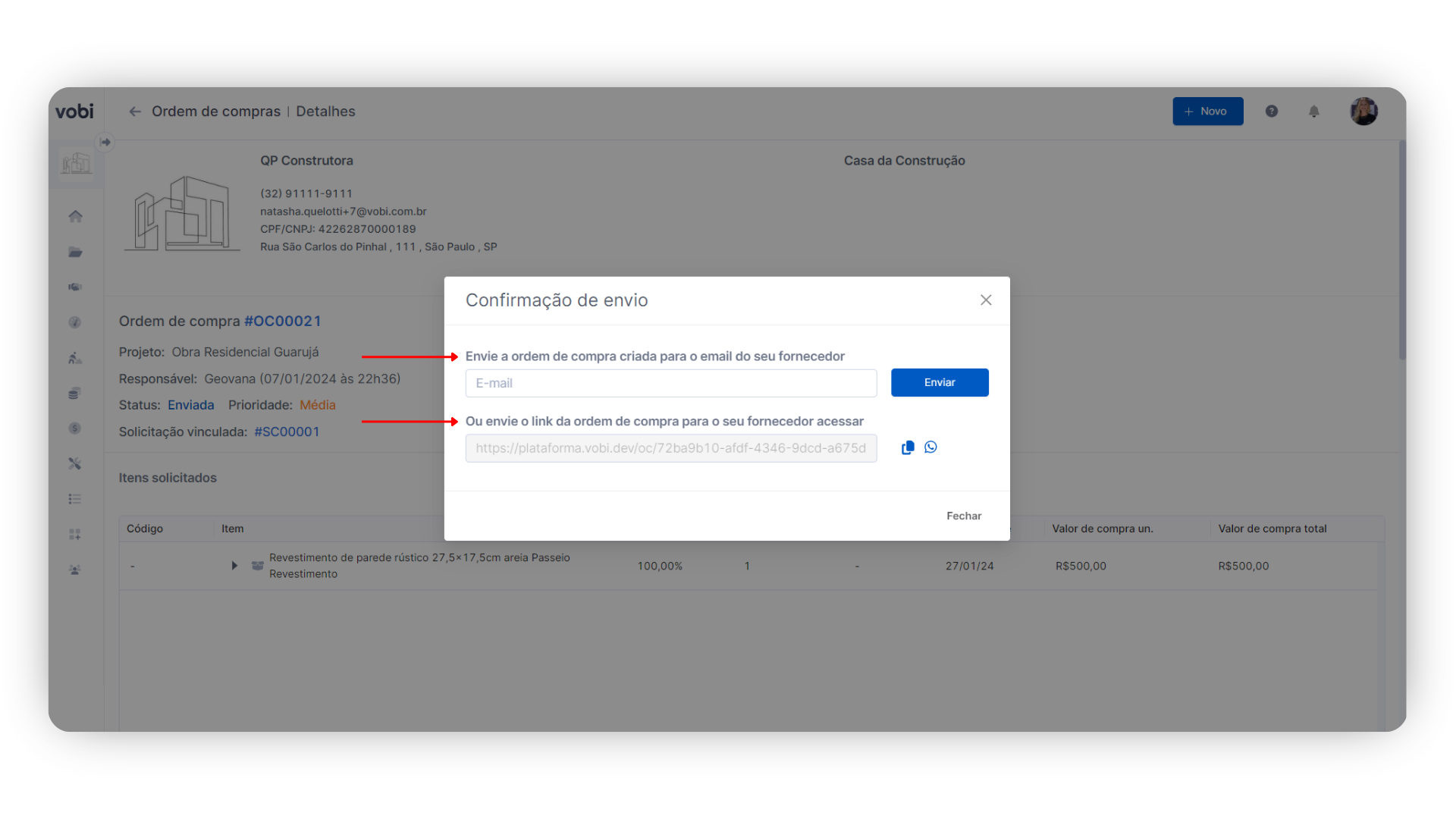 Em ordens de compra com múltiplos projetos, a divisão dos itens será feita pela visão do profissional dentro da Vobi. Para o fornecedor, ele visualizará o total dos itens de forma unificada, mas poderá identificar os detalhes e endereços específicos de cada obra.