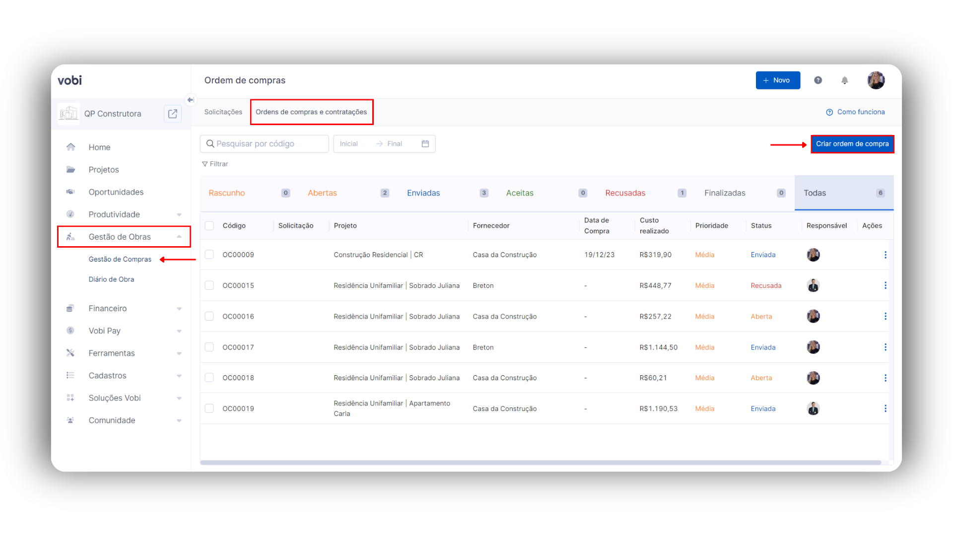 Criar uma Ordem de Compras a partir de uma solicitação: para isso, acesse o módulo de Gestão de Obras, e depois clique em Gestão de Compras. Vá até a solicitação que deseja, clique no ícone de três pontos ⫶ ao lado dela e logo após em Alterar Status > Compra contratação > Mover o status e criar Ordem de Compra/Contratação.