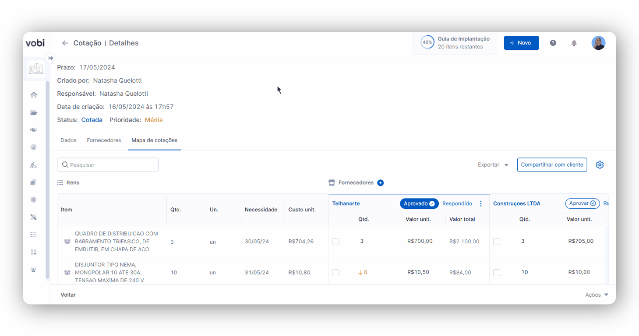 Isso é útil em situações como por exemplo: sua obra precisa de Cimento Portland CP II e Tijolo Cerâmico. Se você criou uma Solicitação/Cotação com esses itens, mas encontrou custos melhores em fornecedores diferentes, pode criar duas Ordens de Compras vinculadas à mesma Solicitação/Cotação. Assim, cada uma dessas ordens terá o item correspondente ao fornecedor específico, facilitando a compra separada e garantindo o melhor custo benefício.