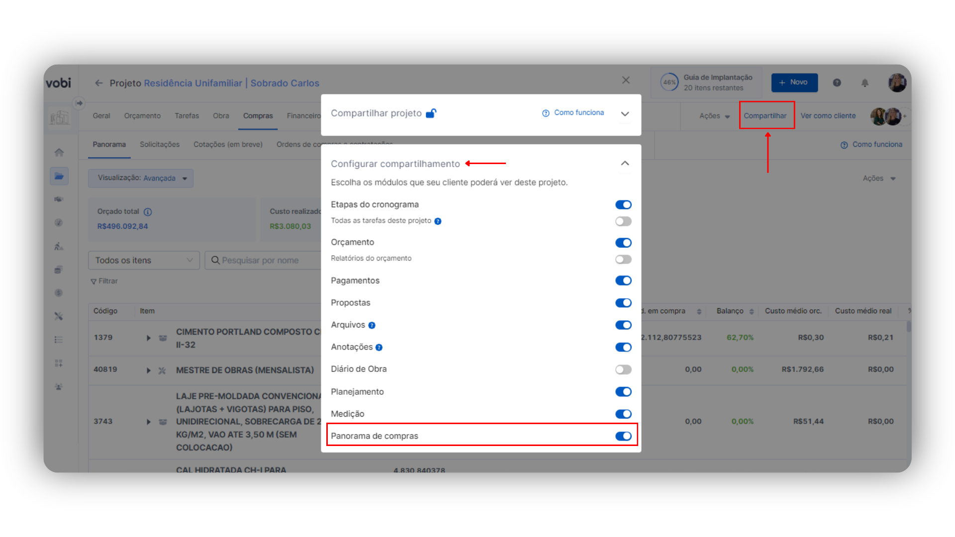 Dica Vobi: Se você utiliza o Benefício e Despesas Indiretas (BDI) e compartilha apenas o preço dos insumos no Orçamento com seu cliente, é importante ficar atento! No Panorama de Compras, os valores considerados são os custos dos insumos, sem a inclusão da porcentagem de BDI. Esteja ciente dessa diferença ao habilitar acesso ao Panorama de Compras.
