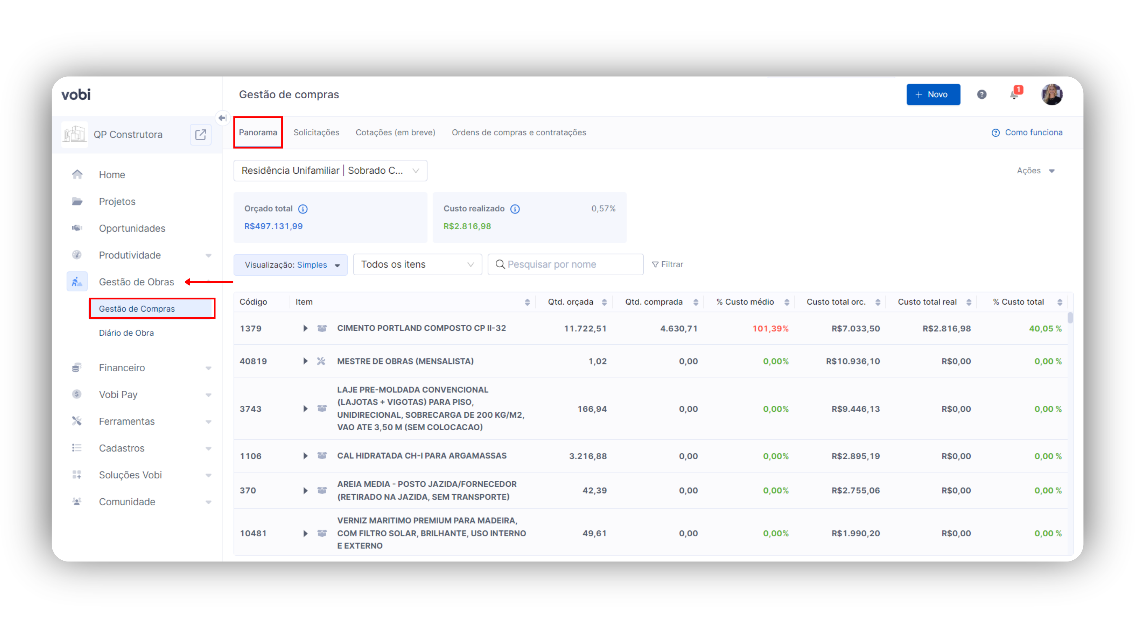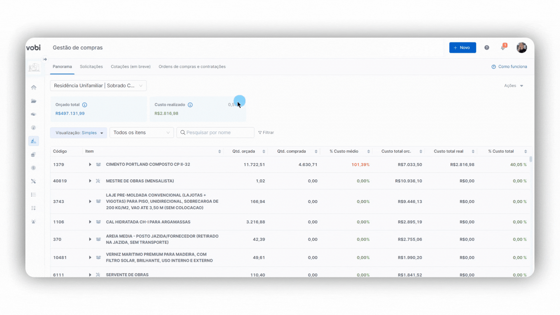 Para utilizar o Panorama de Compras da Vobi, é preciso que você entenda como é o seu funcionamento e tudo que você vai poder analisar para alcançar uma gestão eficiente dos suprimentos de suas obras.