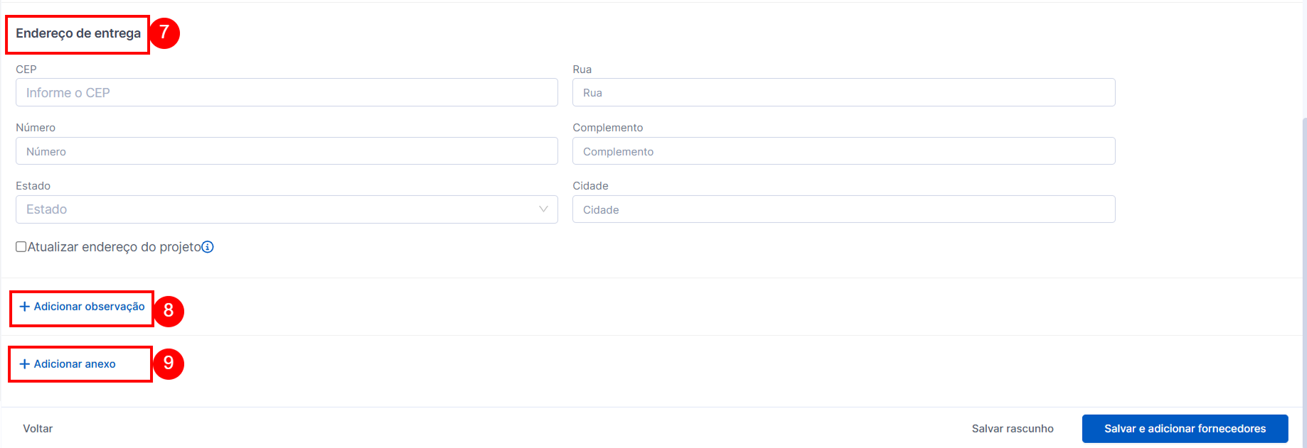 7. Endereço de entrega: a plataforma preenche automaticamente os campos de Endereço de Entrega com as informações cadastradas no Projeto. Mas se precisar, você pode alterar esse endereço para um diferente ou até mesmo atualizar o endereço do projeto diretamente durante a criação do pedido de cotação.