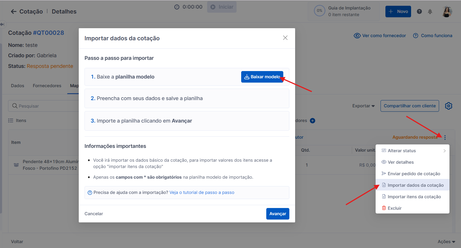 Além do cadastro manual da proposta enviada pelo seu fornecedor, você também poderá utilizar o recurso de importação. Você pode ir nos 3 pontinhos do fornecedor> Importar Dados da cotação > Baixar Modelo para visualizar o nosso modelo de importação de cotações e entender como deverá estar estruturada a sua planilha para utilizar esse recurso.