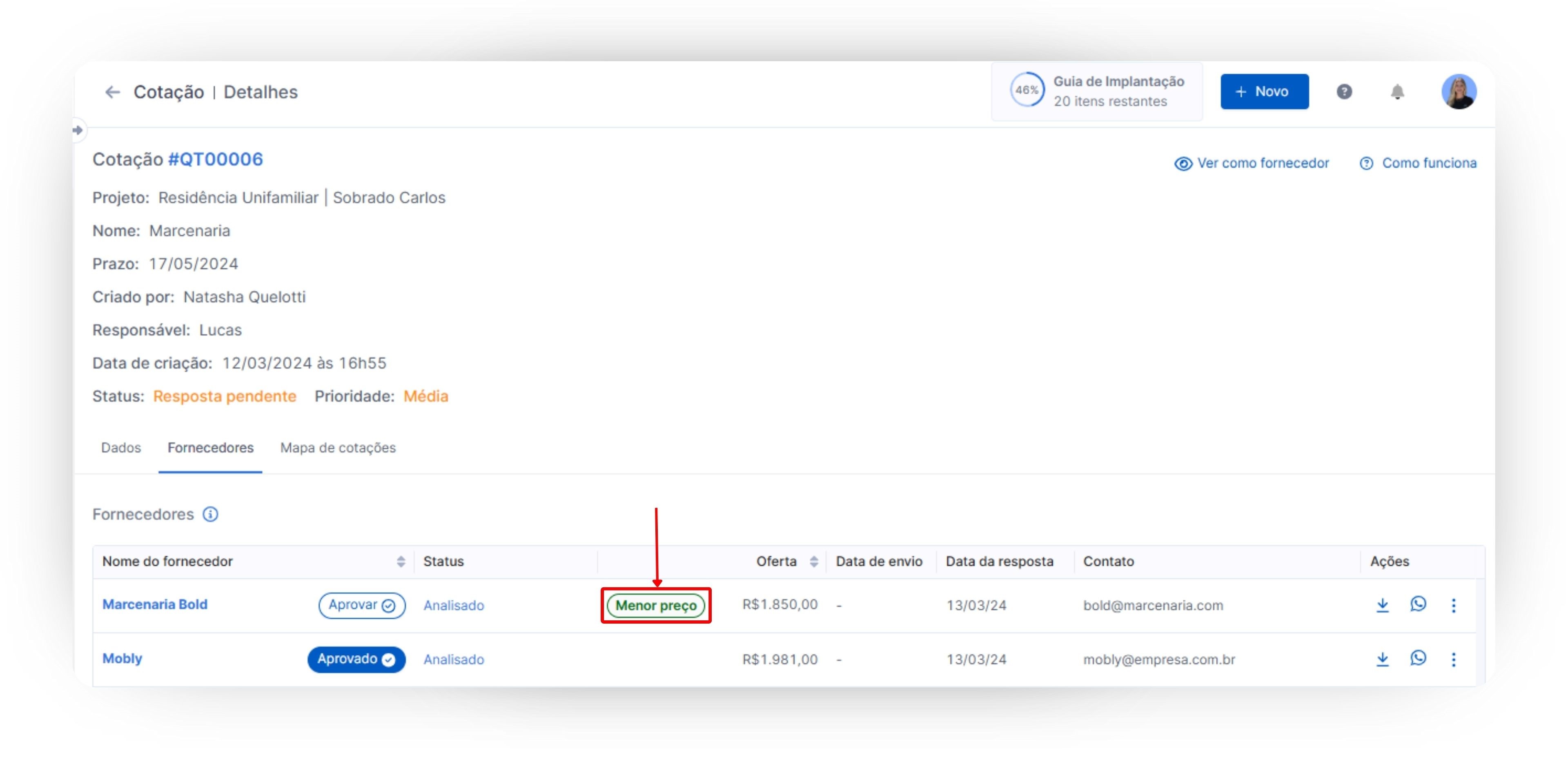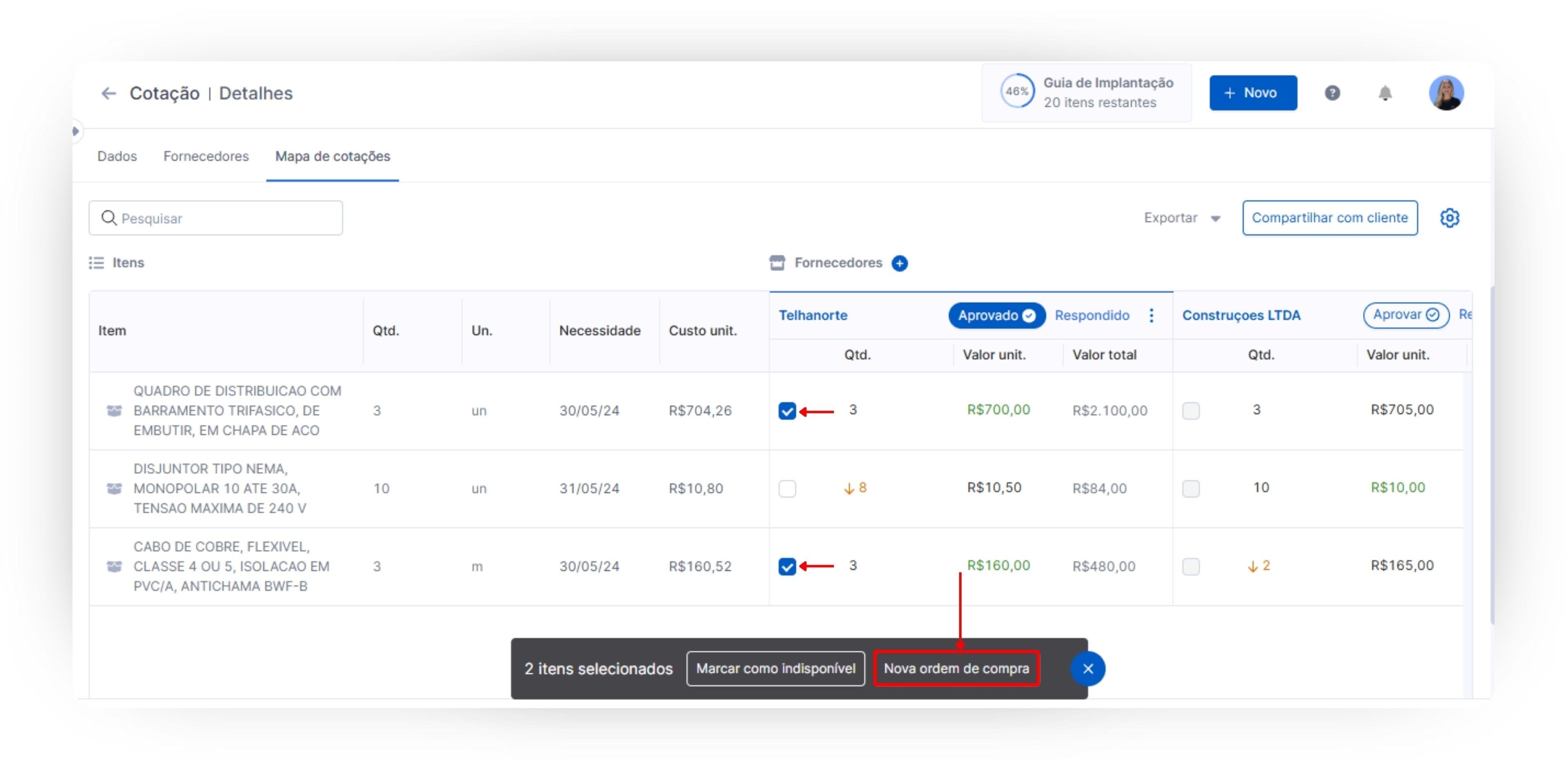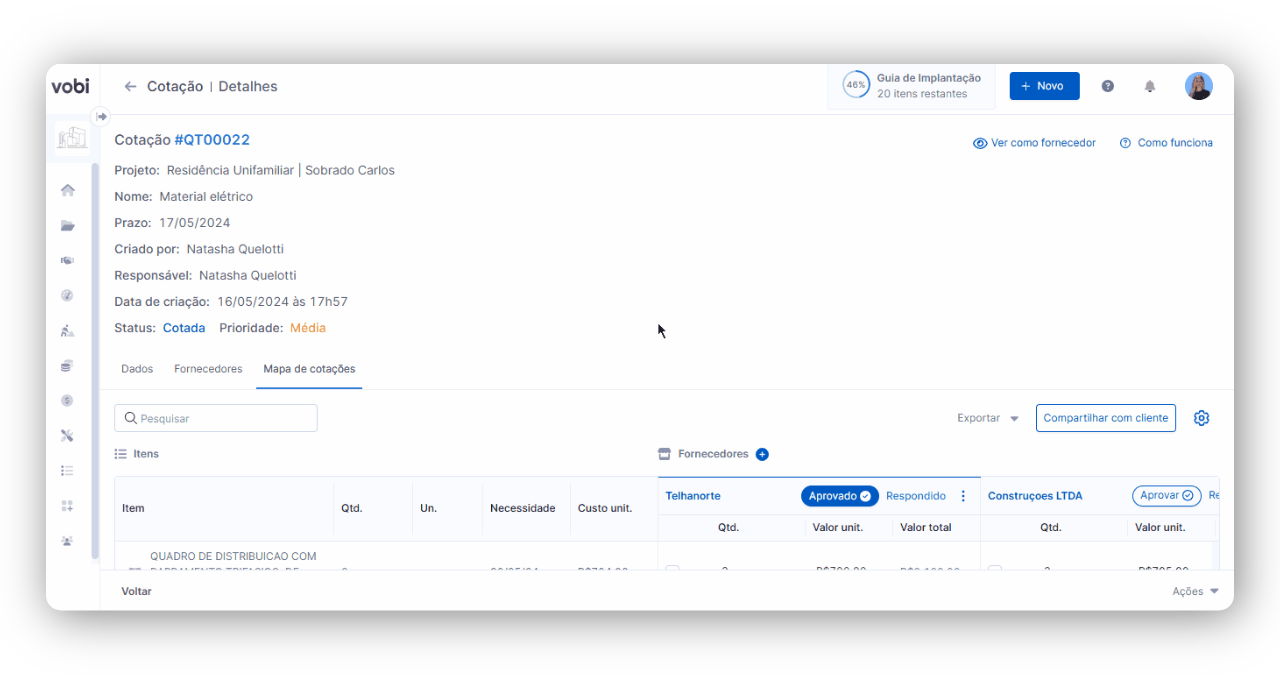 Além disso, você e o seu cliente poderão acompanhar todas as informações sobre as propostas de cotação recebidas dos seus fornecedores pelo Mapa de Cotação. Nele, você terá um comparativo entre os profissionais cotados, visualizando os itens com menor preço unitário, qual a quantidade disponível de cada item, e ainda uma sugestão do fornecedor com o melhor preço, automaticamente, pela plataforma.