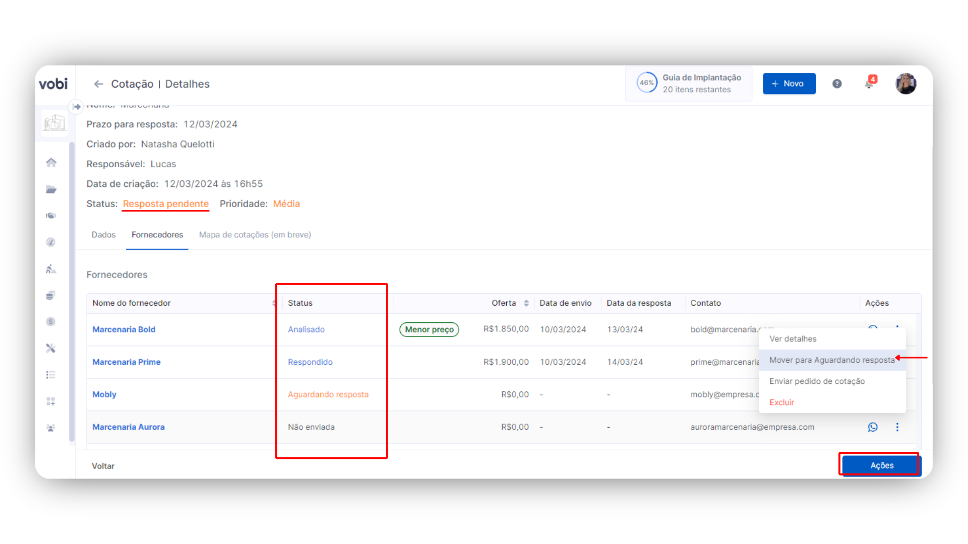 Dica da Vobi: Você pode exportar o seu mapa de cotações em CSV ou Excel através do botão de Ações no canto superior direito da tela.