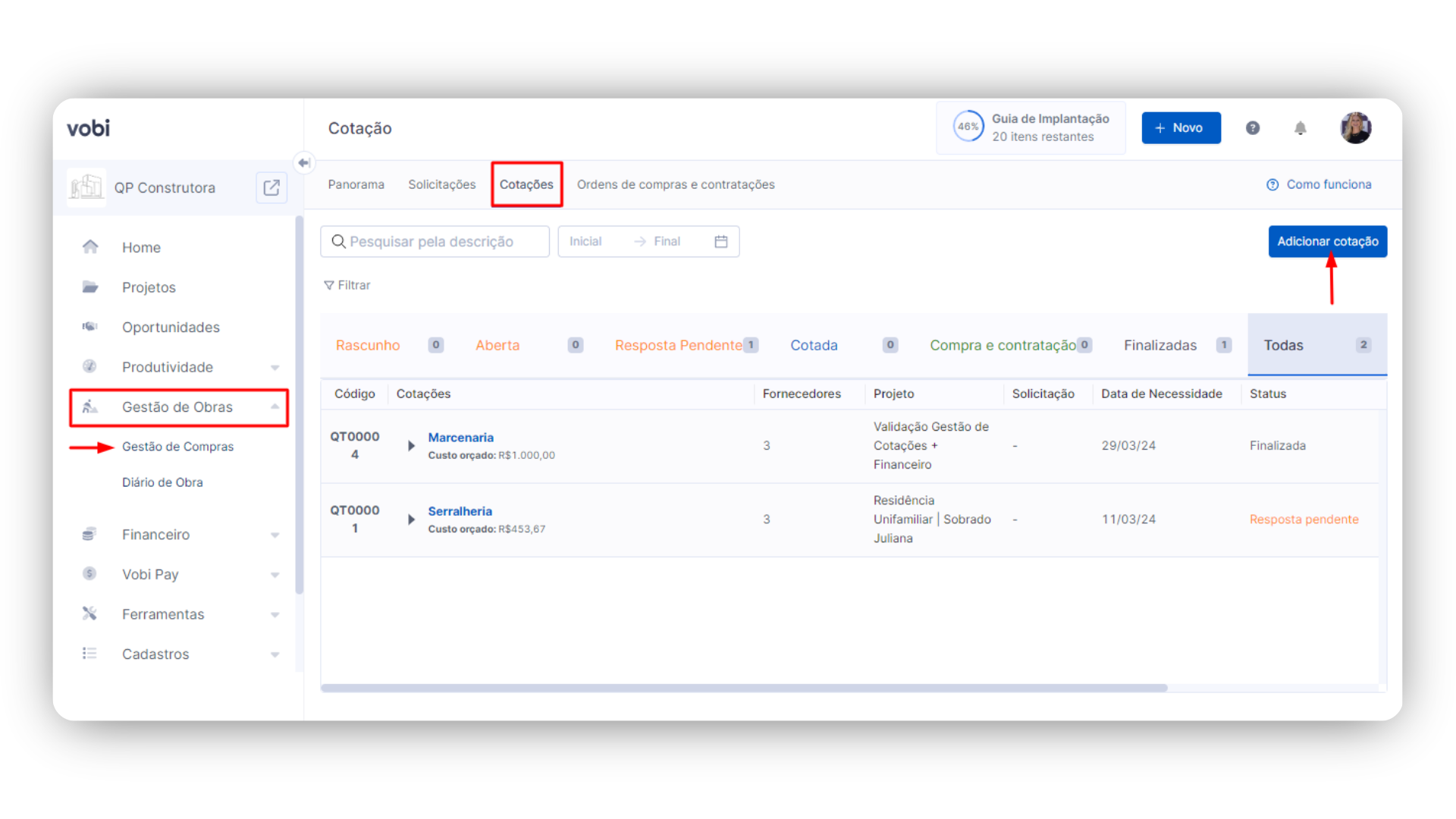 Acesse o módulo de Gestão de Obras no menu lateral e clique em Gestão de Compras. Aqui, você pode clicar na aba de Cotações para acompanhar as cotações de qualquer projeto cadastrado na plataforma.