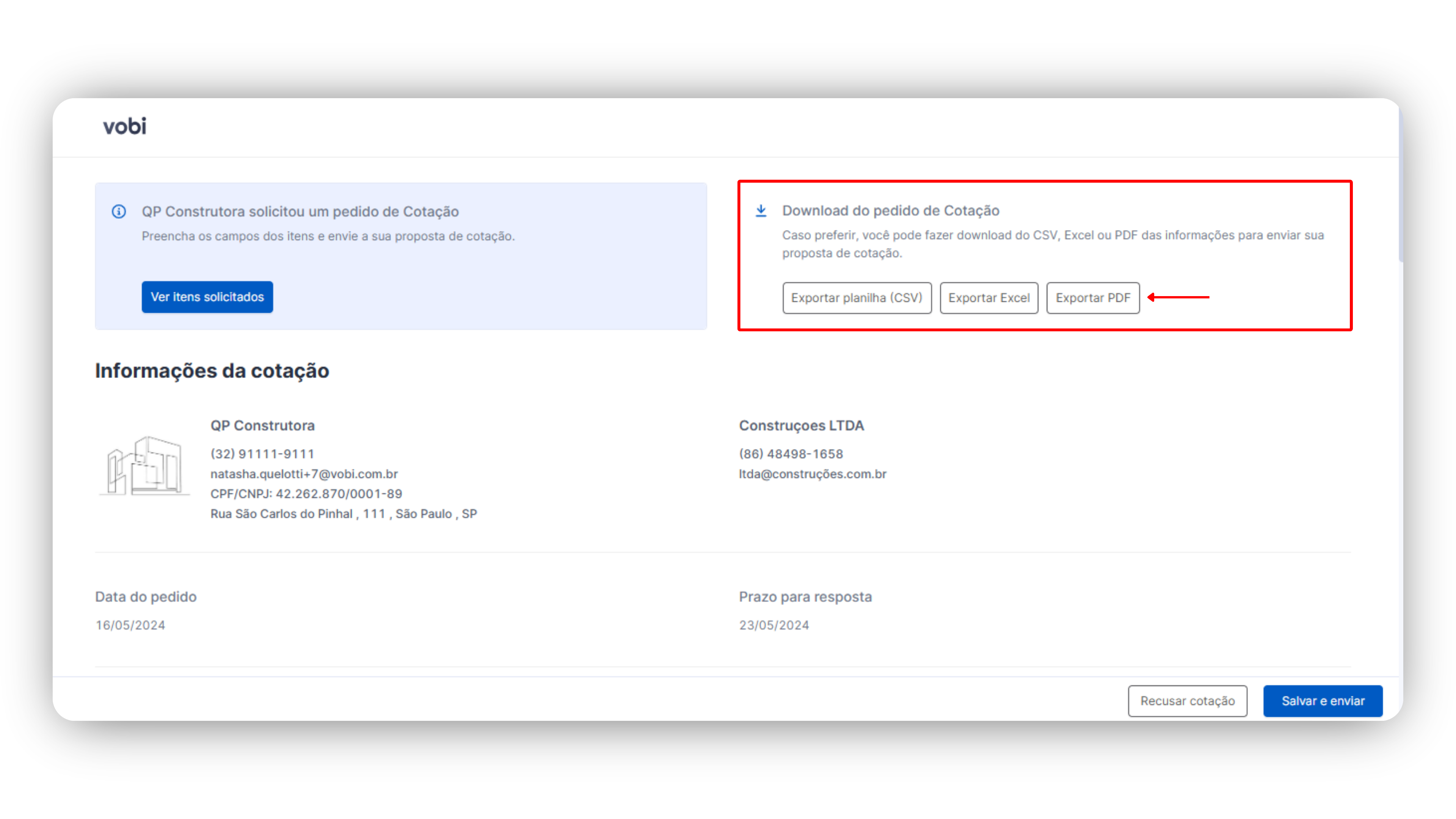 Assim que o seu fornecedor clicar em “Salvar e enviar” no link do pedido de cotação, os dados fornecidos por ele vão estar disponíveis na plataforma. Você poderá acessá-los e, caso necessário, poderá clicar em cada campo e fazer alterações nesses campos.