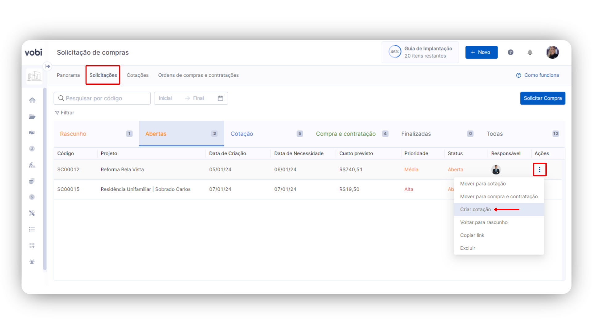 Criar um pedido de Cotação a partir de uma solicitação: para isso, vá até a Solicitação que deseja, esteja ela no status de Aberta ou Cotação, clique no ícone de três pontos ⫶ ao lado dela e logo após em Criar Cotação.