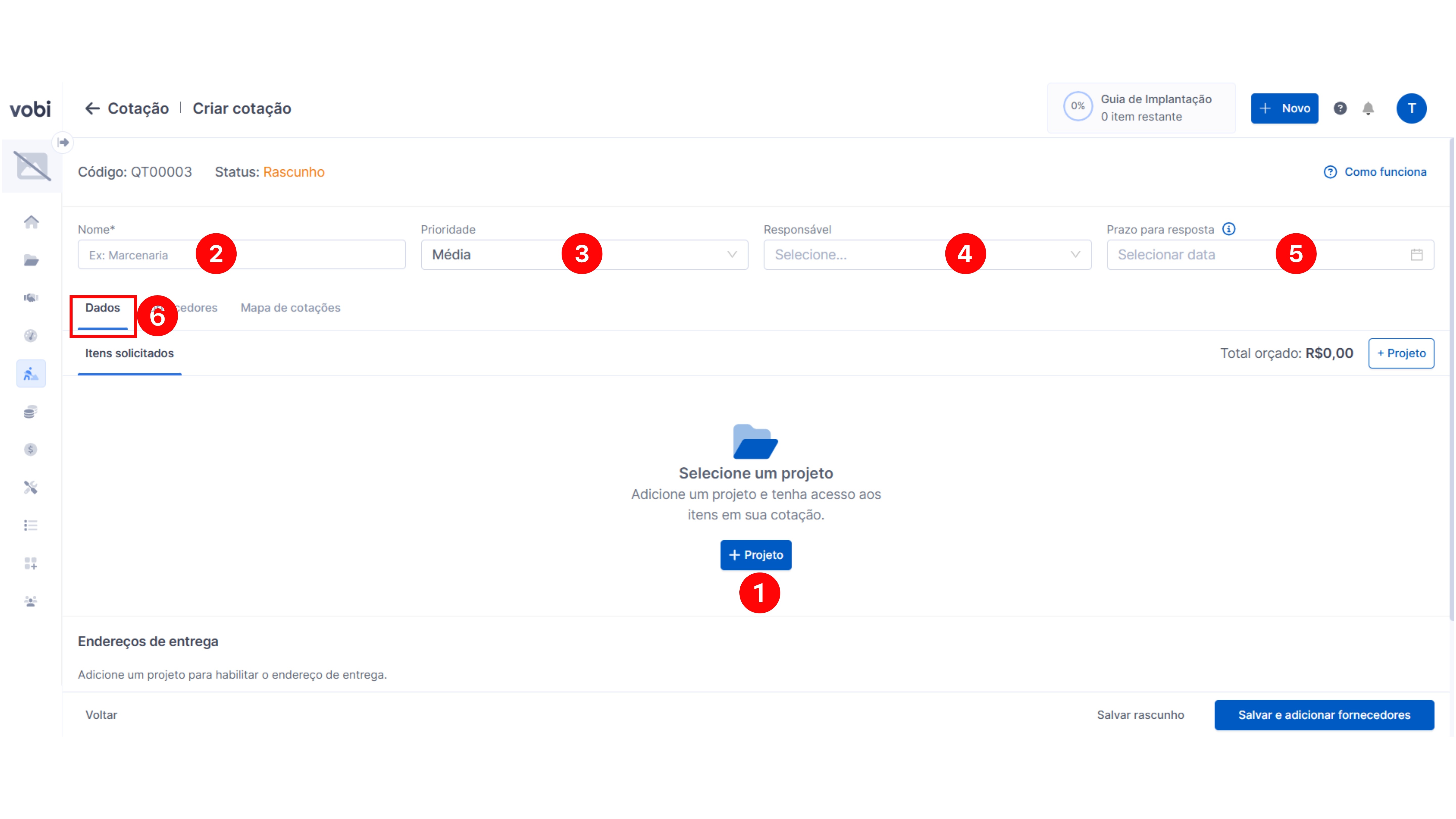 Importante: apenas os campos de Projeto, Nome e Itens solicitados são obrigatórios de preenchimento. No entanto, recomendamos que todos os campos sejam preenchidos para fornecer todas as informações necessárias aos seus fornecedores, facilitando a elaboração das propostas.