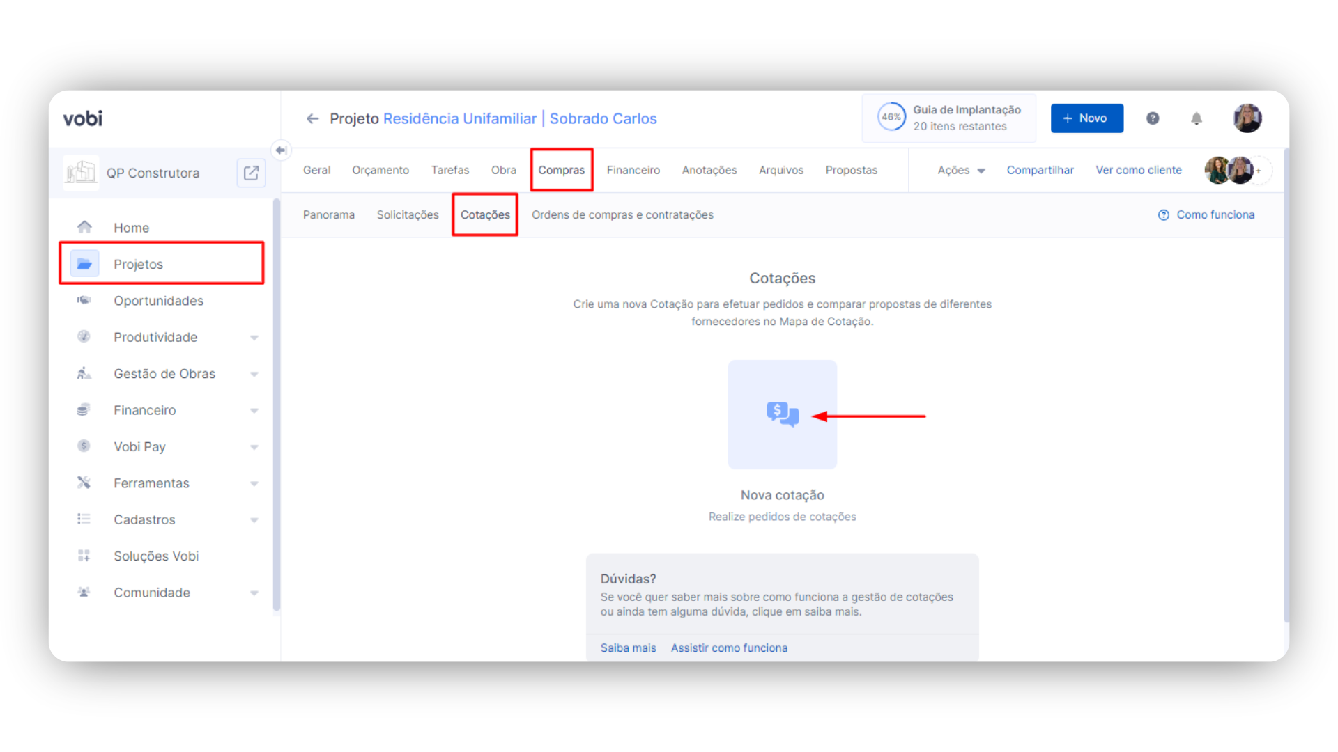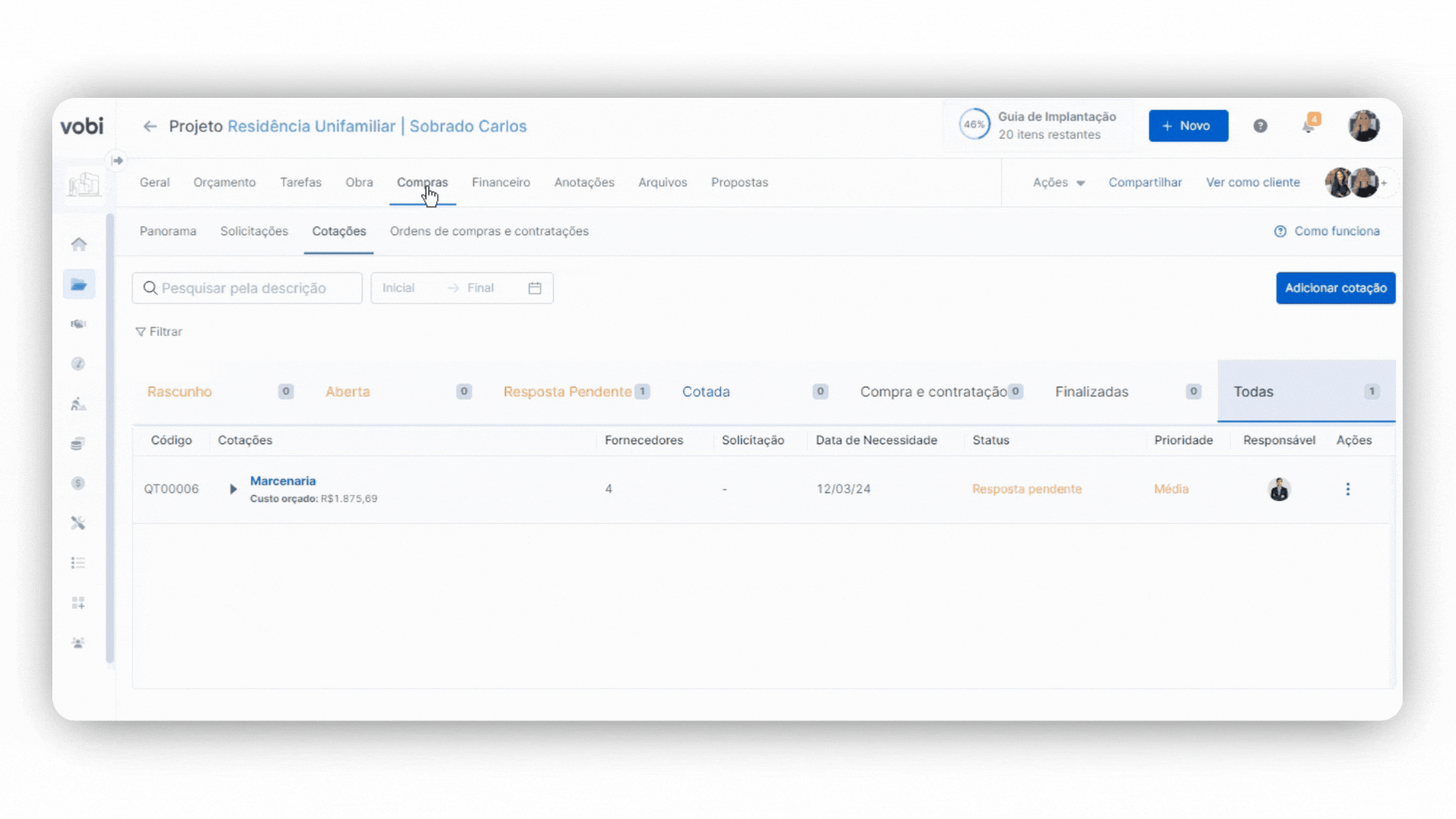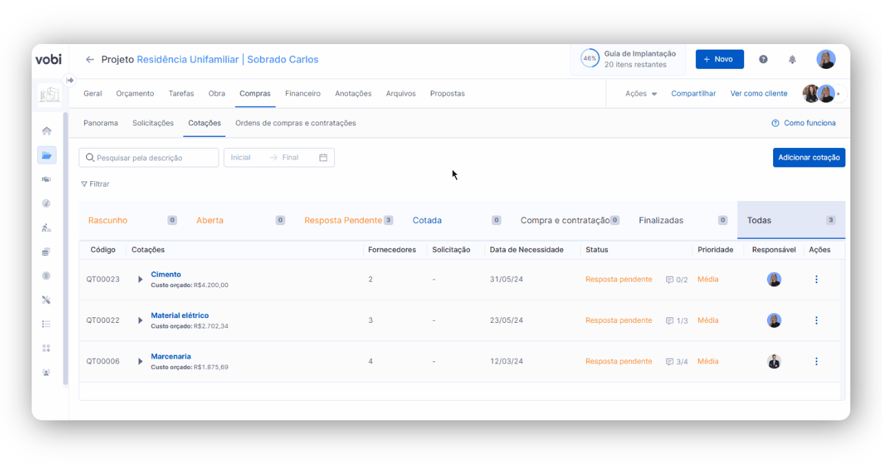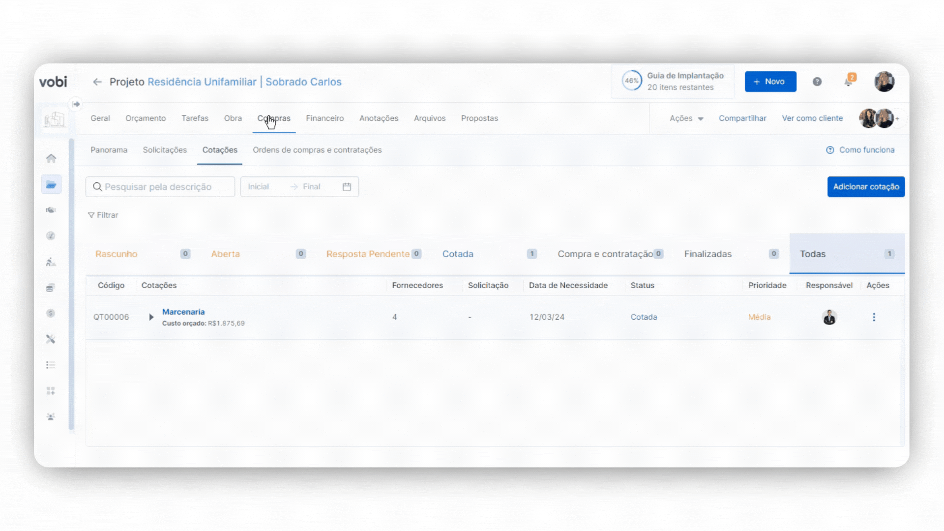 Utilize o módulo geral de Gestão de Obras, indo para Gestão de Compras, ou vá diretamente a um Projeto específico, clique no módulo de Compras e depois na sub-aba de Cotações.
