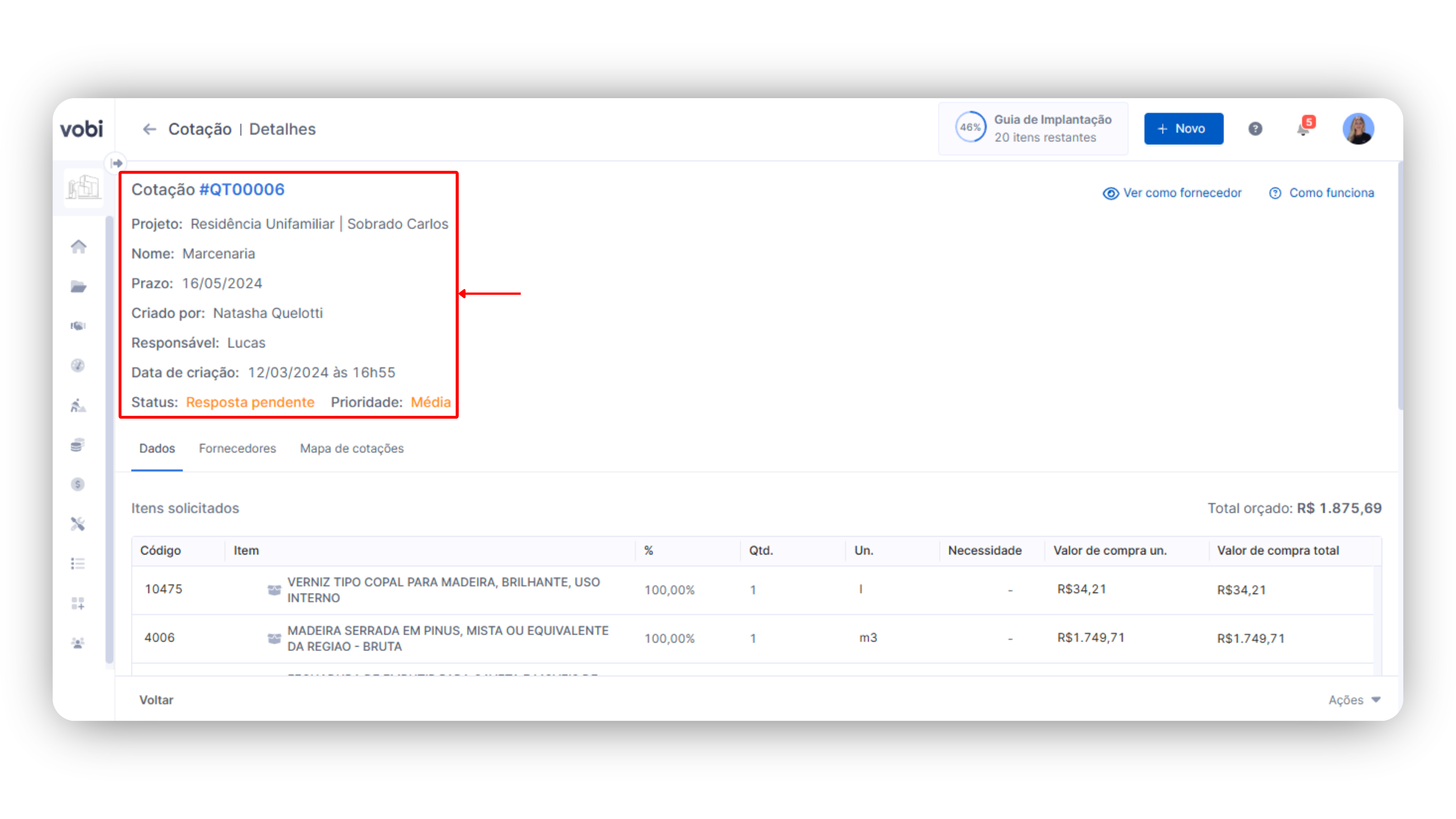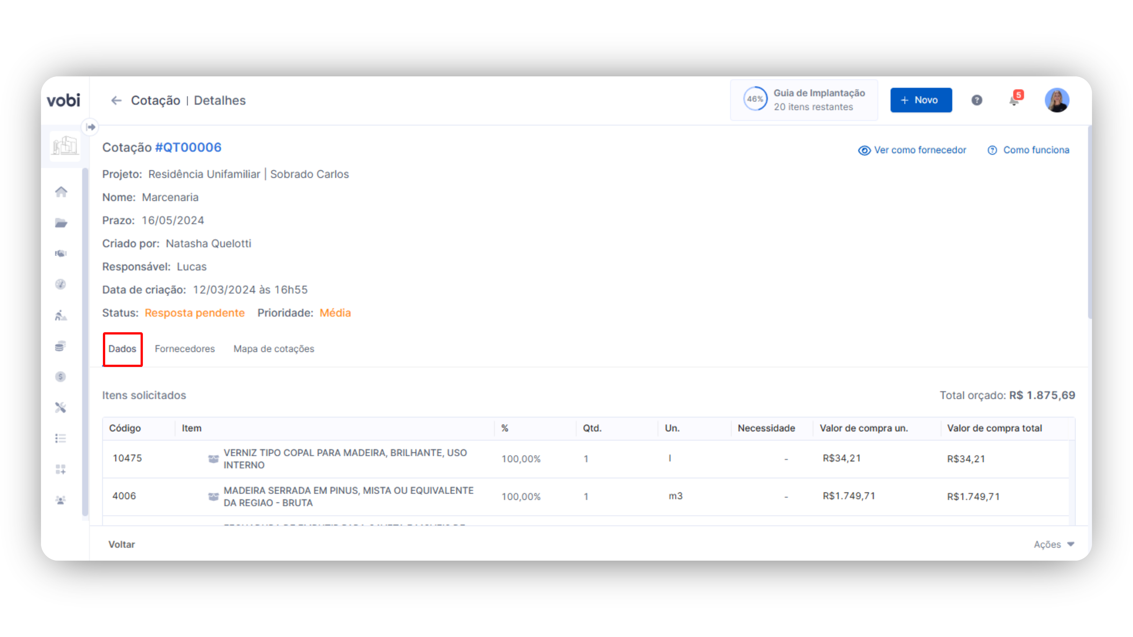 Importante: Para as cotações rateadas em mais de um projeto em dados você pode ver essa divisão, em Itens solicitados. Já o mapa de cotações e o pedido que o seu fornecedor receberá será único, com os totais dos itens solicitados.
