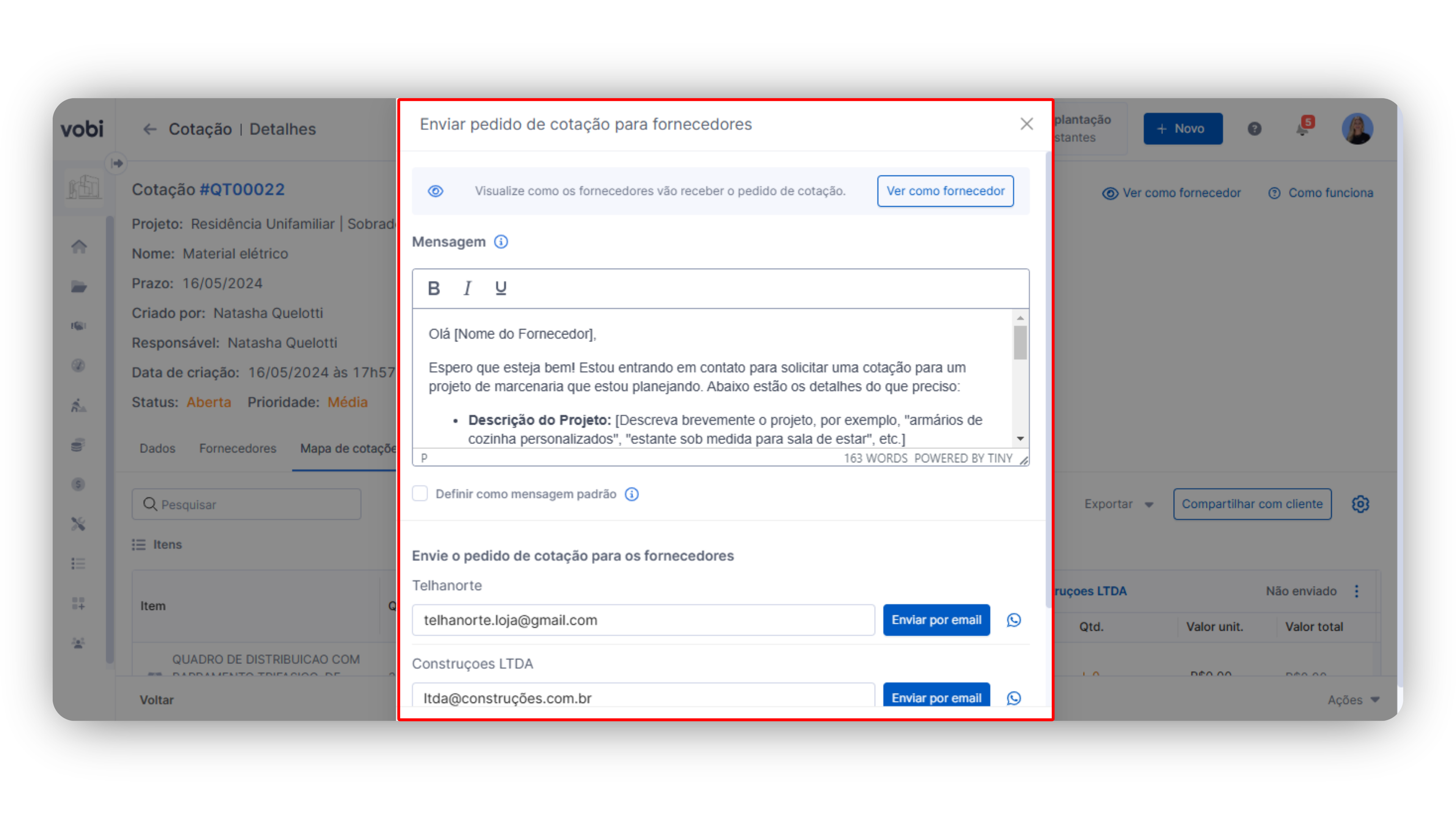 Basta clicar no ícone de + ao lado de cada fornecedor para escolher quais que você deseja enviar esse pedido. Após clicar no botão de Salvar e enviar, você poderá configurar o envio de pedido de cotação para os fornecedores: