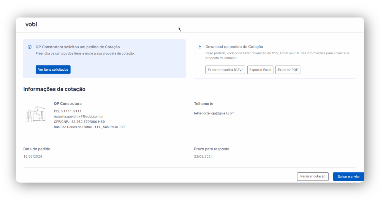 Quando o seu fornecedor recebe o link via E-mail ou WhatsApp, ele é direcionado para uma página contendo todos os detalhes do pedido de cotação.