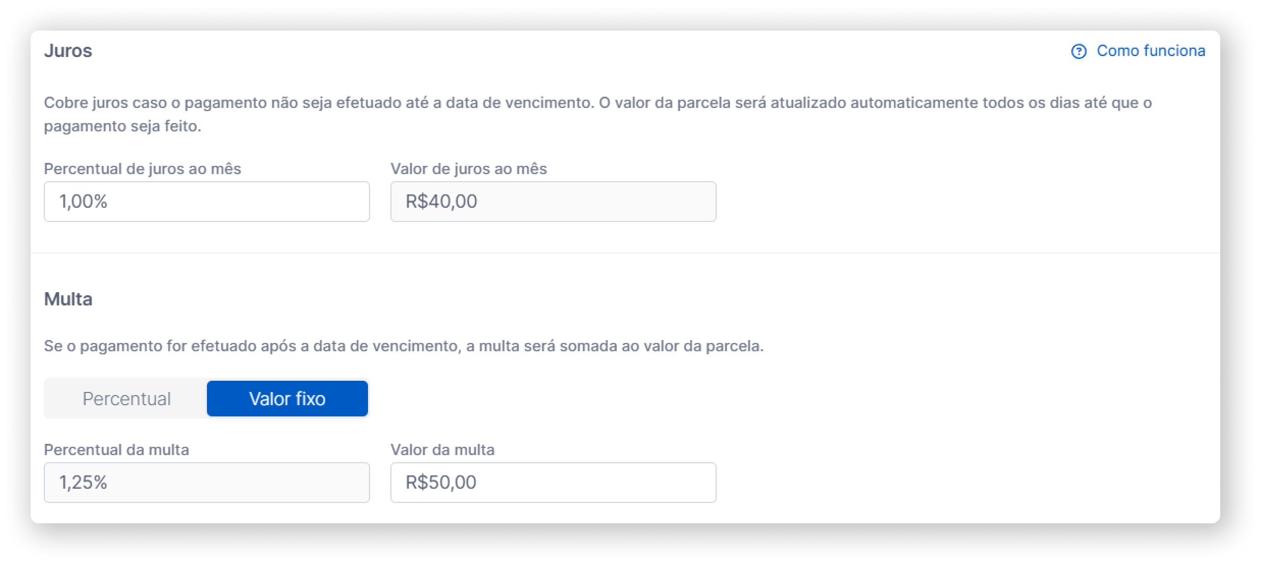 Para a multa, configure o percentual ou valor fixo a ser adicionado caso o pagamento seja realizado após o vencimento.