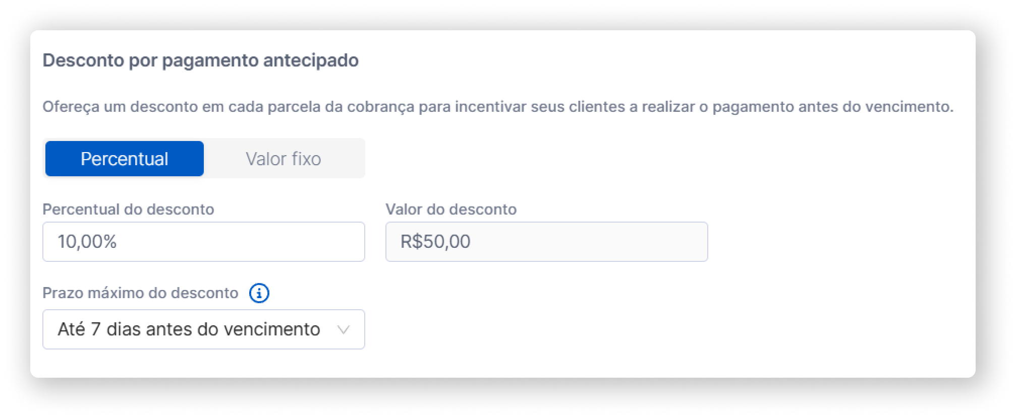 O cálculo para o desconto por pagamento antecipado é muito simples e pode ser definido um percentual ou valor fixo.