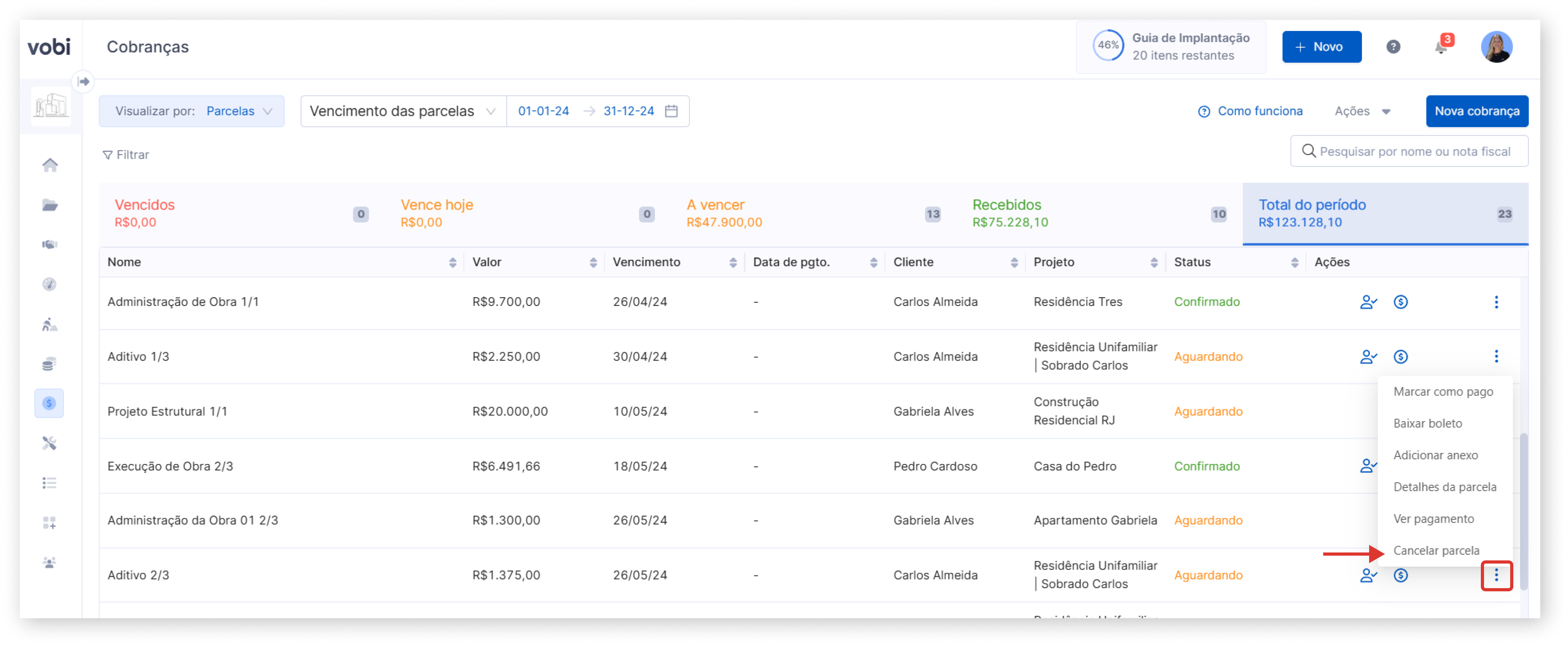 Se o pagamento foi feito com cartão de crédito, não é possível editar essa cobrança. Nesse caso, você precisará cancelar a parcela clicando no ícone de três pontos ⫶ ao lado dela e selecionar a opção 'Cancelar parcela'. Em seguida, será necessário criar uma nova parcela com as configurações que deseja.