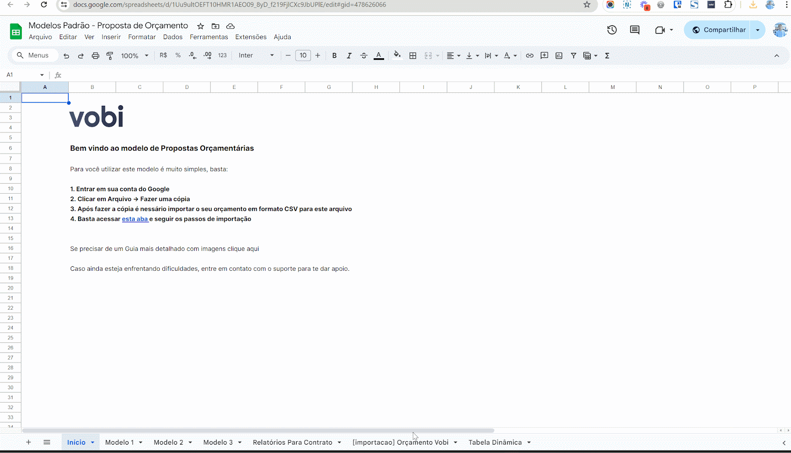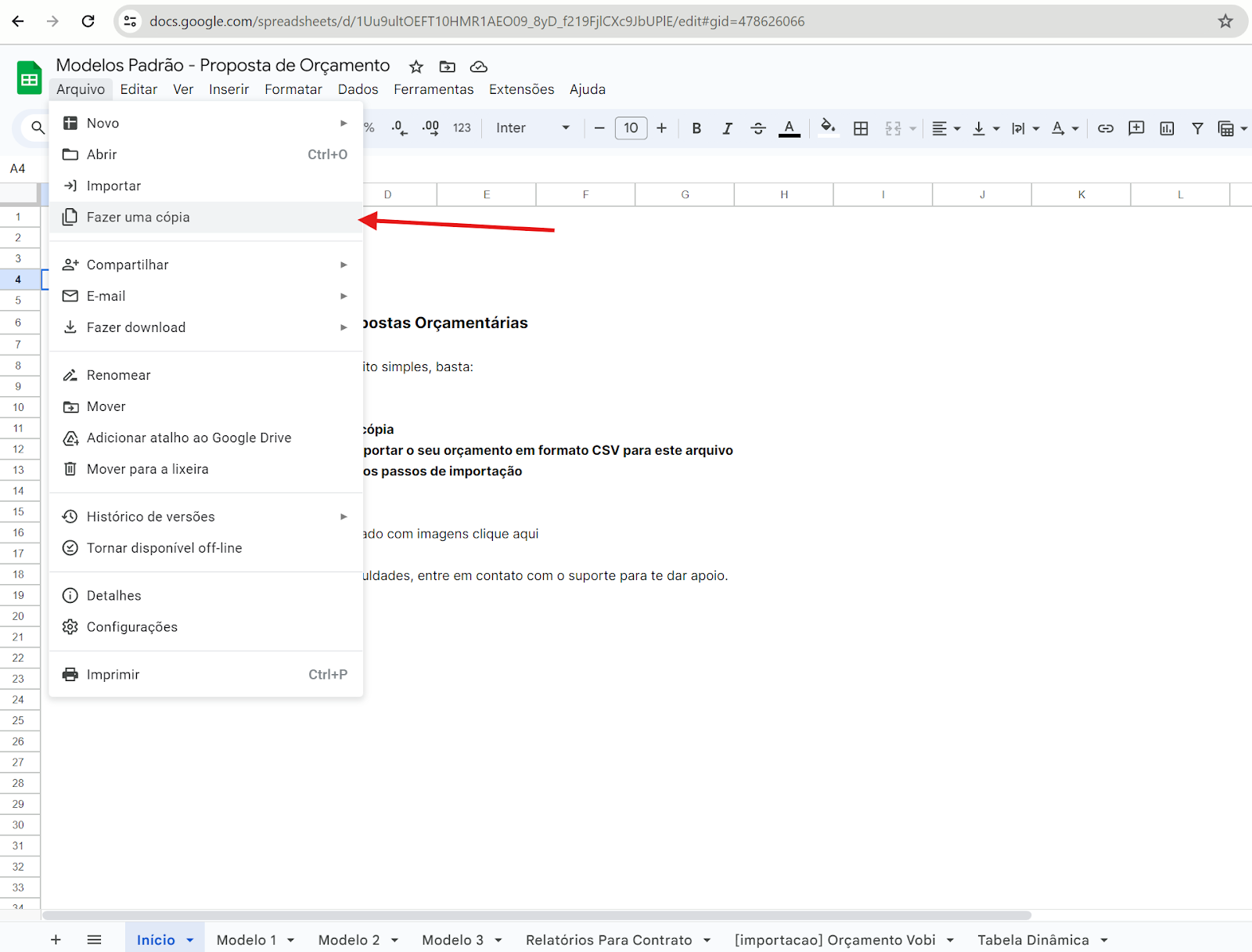 Agora que você exportou seu orçamento da plataforma, você deve acessar nosso Modelo de Propostas de Orçamento, clicar em Arquivo e depois em Fazer uma cópia.