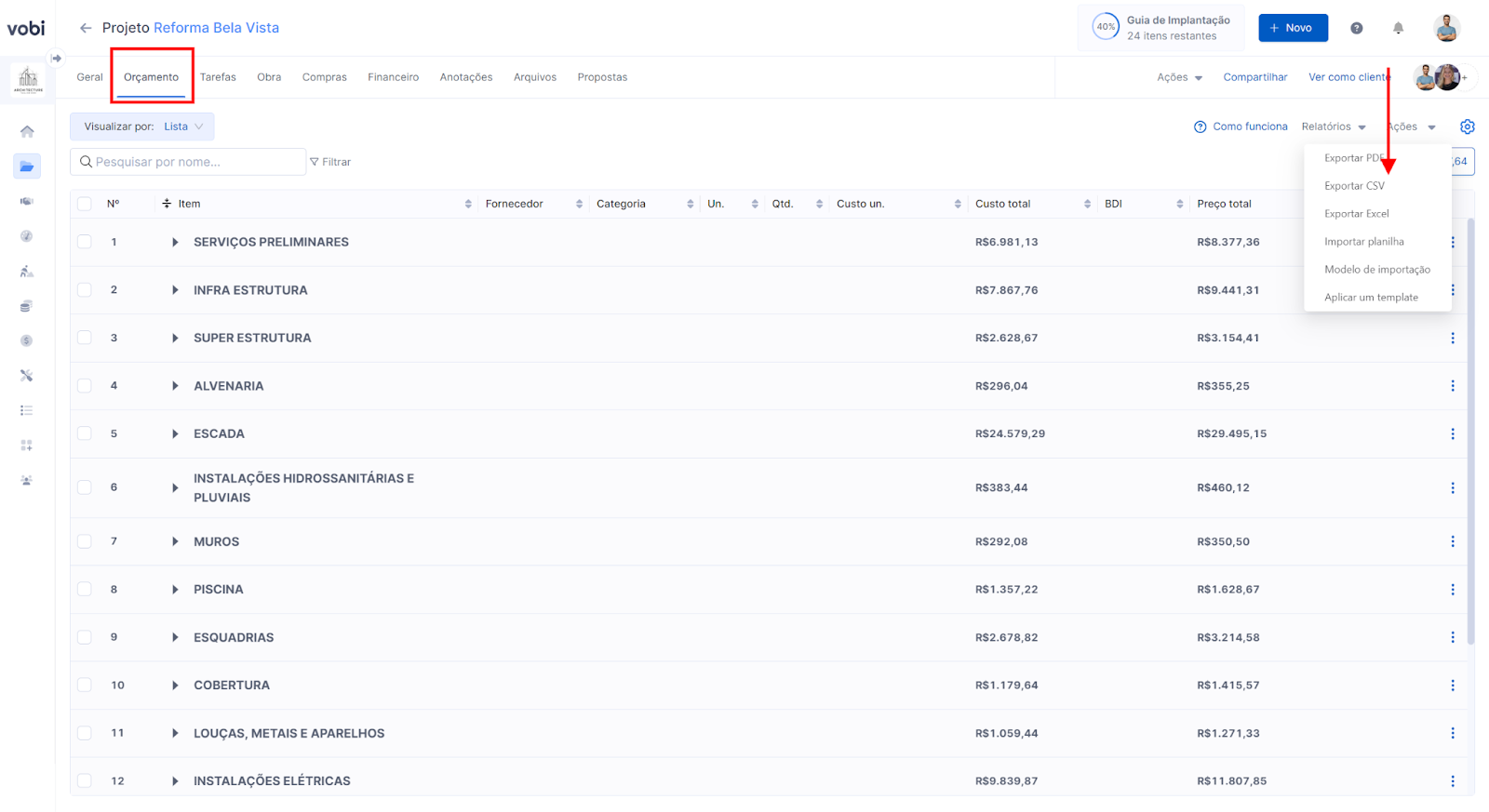 Seu primeiro passo será acessar o seu Orçamento da plataforma Vobi, clicar em Ações no canto superior direito da tela e logo após em Exportar CSV.