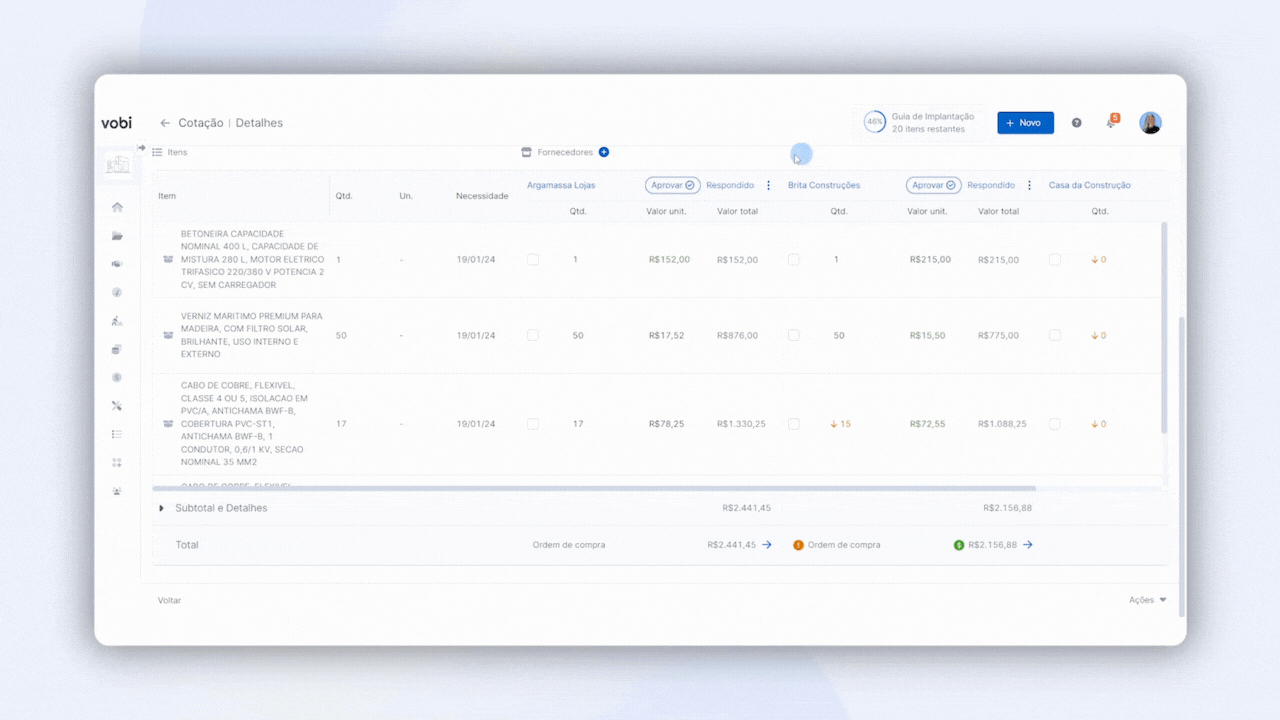 Novidade: Mapa de cotações na gestão de compras da VobiCom o mapa de cotações na Vobi, você terá o comparativo entre os fornecedores cotados, visualizando os itens com menor preço unitário, a quantidade disponível do item, e ainda uma sugestão do fornecedor com o melhor preço, automaticamente, pela plataforma.