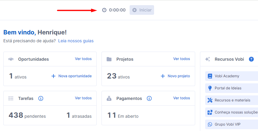 1. Com a extensão instalada, acesse a plataforma Vobi e você verá o cronômetro na sua tela.