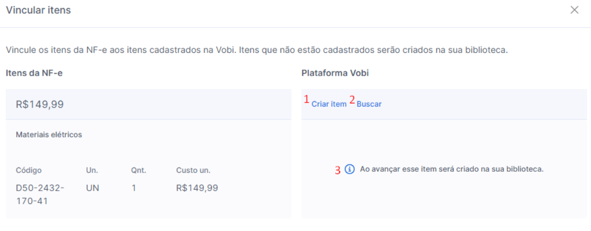 Conforme a imagem a seguir, a plataforma irá sugerir os itens encontrados na sua bilbioteca ou orçamento automaticamente. Caso não seja encontrado, você poderá: