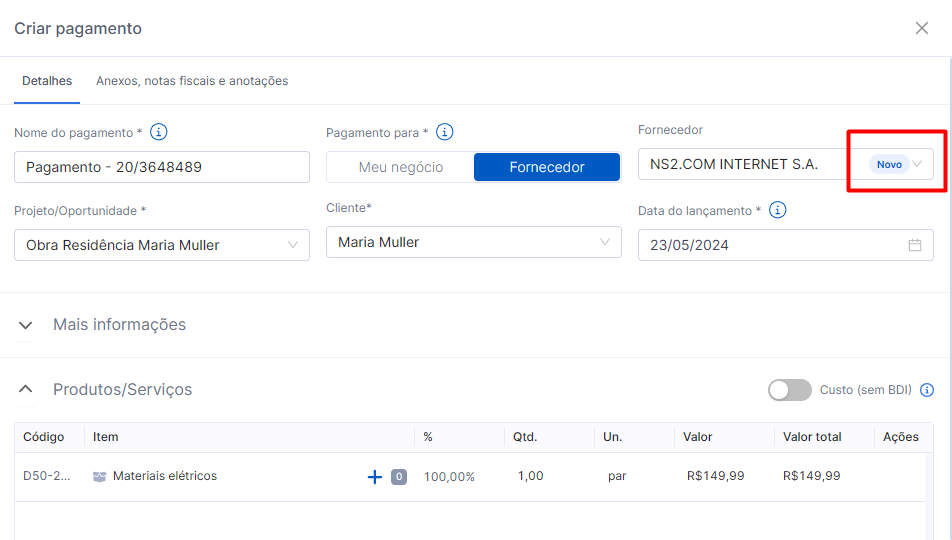 Caso o fornecedor com o CNPJ da nota fiscal não exista nos seus cadastros você verá uma indicação de "novo" no campo do fornecedor, dessa forma, ao salvar o pagamento, o fornecedor também será criado com seus dados extraídos automaticamente da NF.