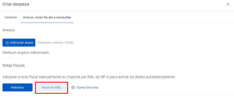 Você também pode importar o XML a seção de notas fiscais. Dessa forma, apenas a nota fiscal é preenchida, ou seja, os dados do lançamento financeiro não são alterados.