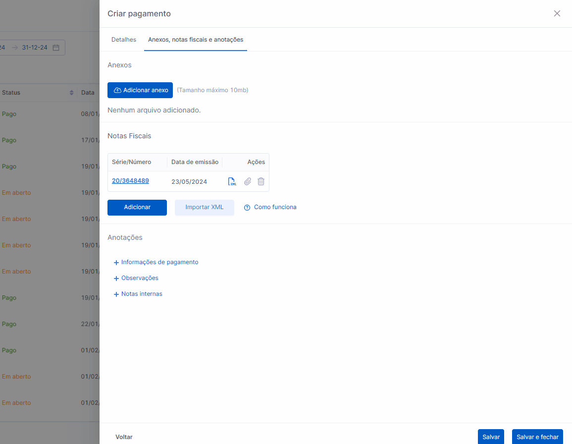 Suas notas fiscais importadas poderão ser consultadas nos detalhes dos seus pagamentos e de suas despesas, basta clicar no número da nota fiscal para visualizar todos os detalhes.