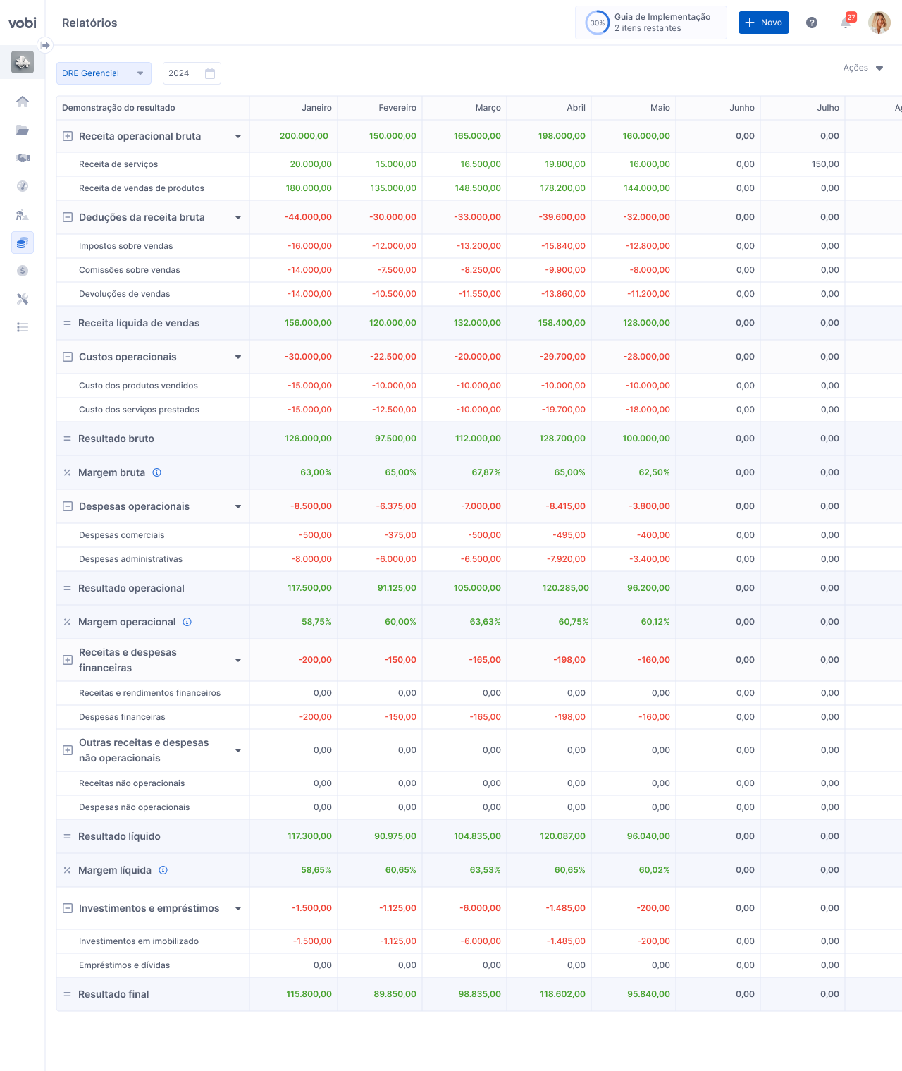 Com a gestão financeira da Vobi, analisar os resultados financeiros da sua empresa é uma tarefa muito mais simples. Para esse objetivo, o Demonstrativo de Resultados do Exercício (DRE) Gerencial da Vobi é uma ferramenta que trará visibilidade total do resultado do seu negócio de forma automatizada.