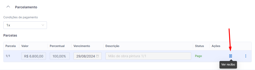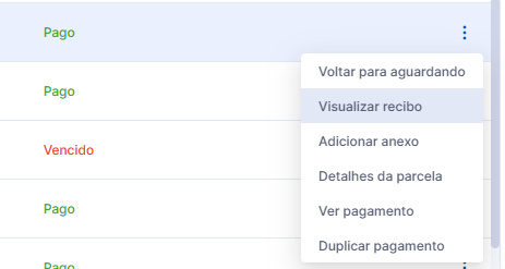 Para visualizar um recibo já emitido, basta acessar os 3 pontinhos de uma parcela paga e clicar na opção Visualizar recibo.
