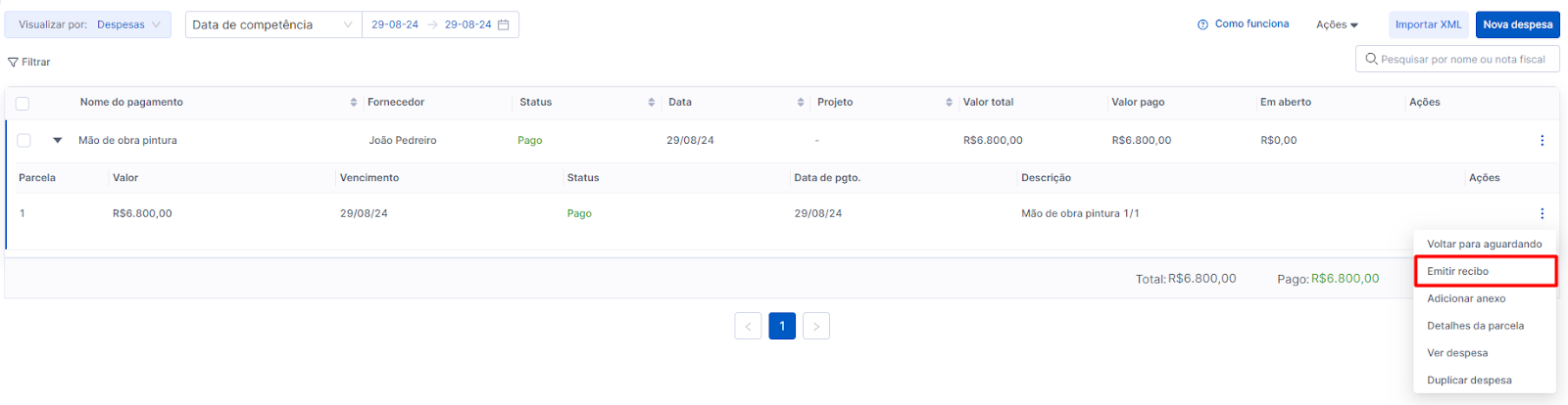 O recibo será preenchido automaticamente com os dados do fornecedor cadastrados na despesa.
